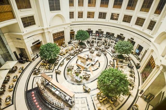 从酒店的大厅的2楼通往酒店酒吧的地方来看整个区域,除了标准的五星级酒店装修风格以外,就是穿插了一些具有民国风格的武汉风格的建筑物,诸如这室内眼前的大门。