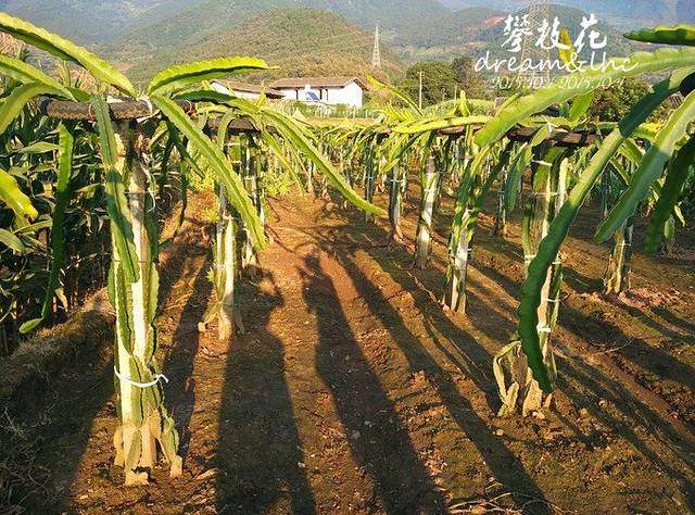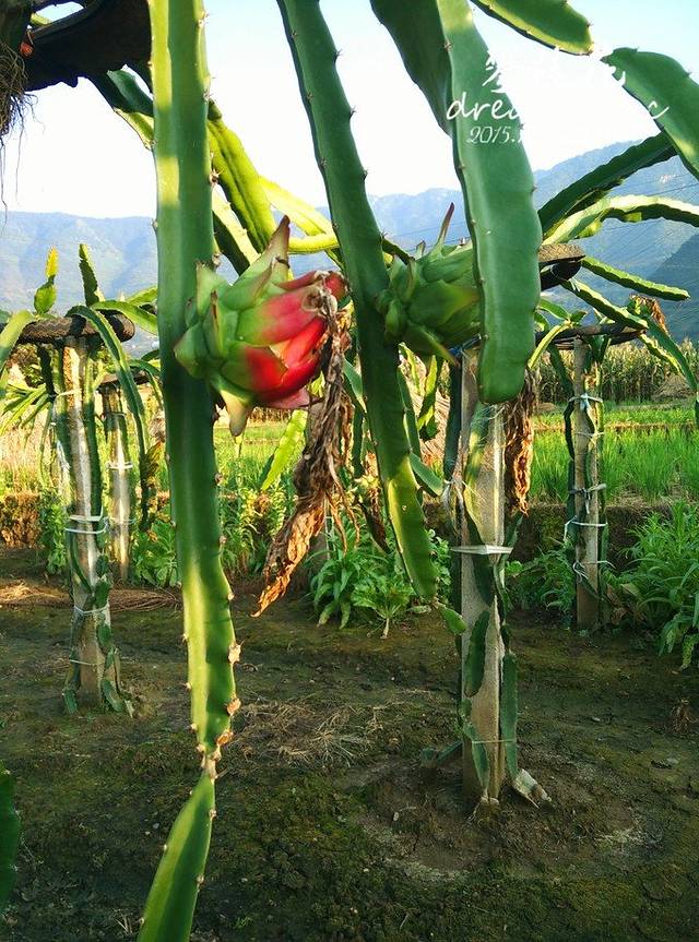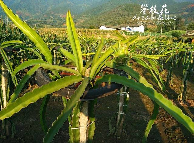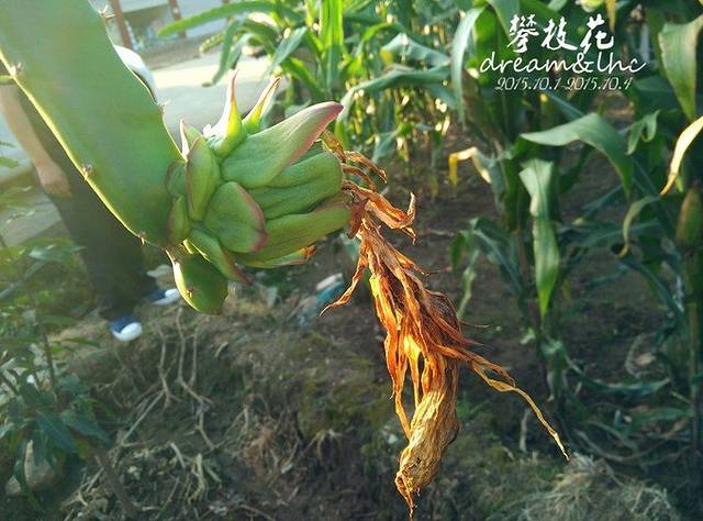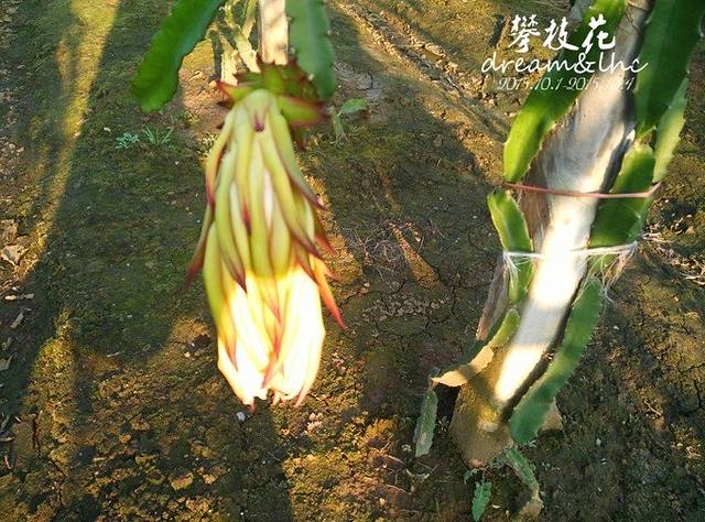 火龙果树只有晚上开花,乡民说开花的时候非常好看,很大一朵,如昙花一般,早上太阳出来花即凋谢,然后开始结出火龙果来。这里的都是红心火龙果