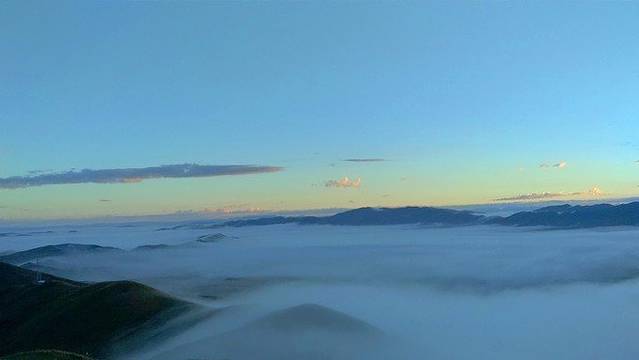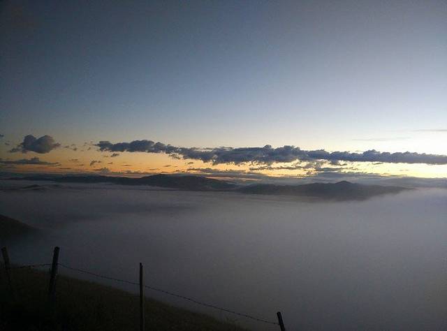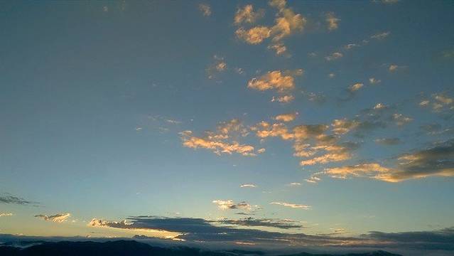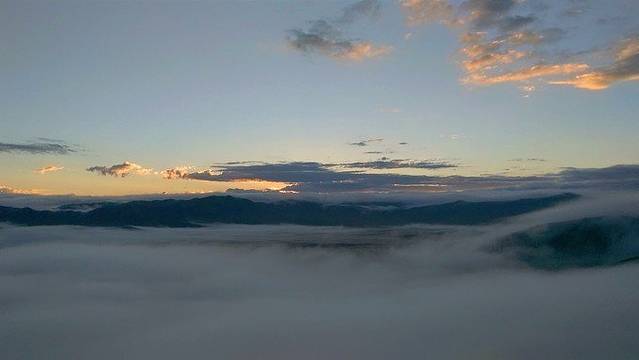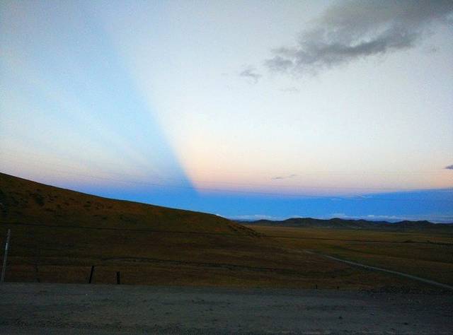 天快黑了的时候,我们拍下的晚霞,很神奇,中间少了一道。第二天我们又看到了同样的情况,现在在想多半是远处有座很高的雪山把夕阳的光线挡了一道!~???