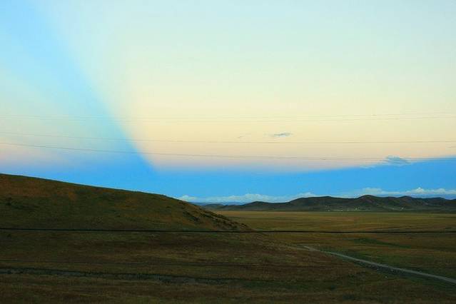 草原上即将落下的太阳,这是我们在那段崩溃的60公里的道路上拍的,一路都是美好的风景。