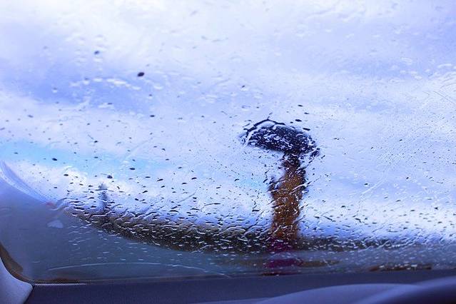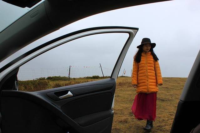 结果刚把车开上山顶,就开始下大雨了!无奈,我们只有躲在夫德平上避雨,前面挡风玻璃上都起了一层水雾,写下若尔盖!