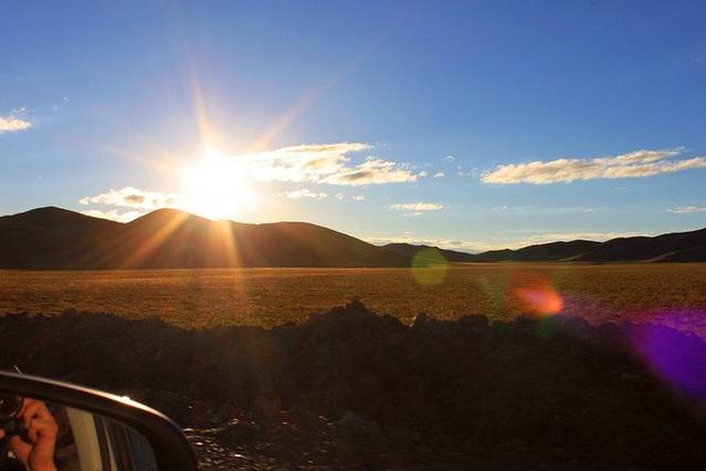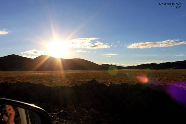 这段路就不得不吐槽一下了,真的是太烂了,底盘不停地被磕到,灰尘也大。而且我们是一路向西走,那西下的太阳完全晄得人睁不开眼,即使带了墨镜,前面也是一道白光,对面的车都要眼前了都看不到,那一段真的是痛苦极了!我们基本要以5公里每小时的时速通过,一路上又是修路,又有大车。全程60公里的路程我们开了3个小时,到唐克已是晚上9点了!