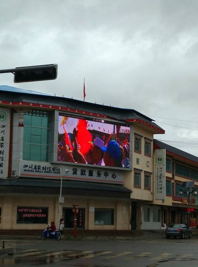 又走了2小时,到达了若尔盖县城,远远看去完全就是个藏寨,颇有特色!我们在县城的中心这块大屏幕上还看了9.3大阅兵,祖国威武!