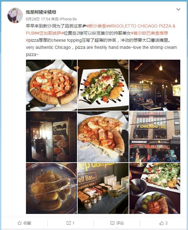 向大家介绍芝加哥披萨专营店RIGOLETTO CHICAGO PIZZA&PUB。在这里可以享受3~5cm厚的正宗芝加哥披萨,这里也成为了年轻人的最爱。光是看着披萨上满满的芝士,就止不住的流口水,简直是芝士爱好者的天堂。另外也可以根据个人口味添加食材,做出独一无二只属于自己的披萨。为了配合披萨的口感,店家还准备了各式啤酒。店内的雅致氛围也是情侣约会朋友聚会的好去处,如果想体验正宗芝加哥披萨和啤酒的话,就赶紧去RIGOLETTO CHICAGO PIZZA&PUB吧感受吧。