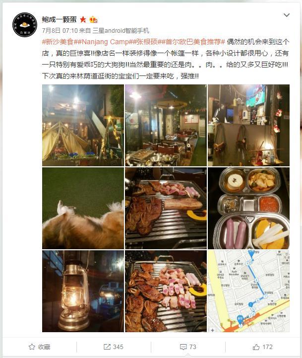 向大家介绍“ Nanjang Camp林荫路店”。这家店以野营帐篷为主的装修风格深深吸引了大家的视线,在店内用餐的同时给人一种正在露营般的享受。主营料理是在烤盘上烧烤各种食材,根据人数店家会提供合适的AB套餐。店内全部采用真正露营时使用的厨具和餐具,给你全新体验。适合各种聚餐聚会,如果你想寻找林荫路的美食,首尔欧巴向你推荐“Nanjang Camp林荫路店”。