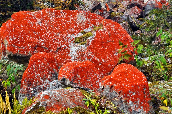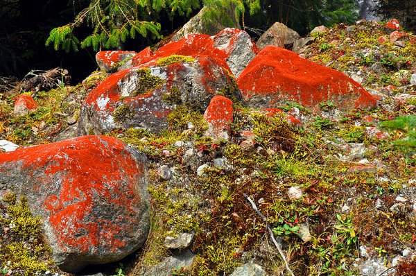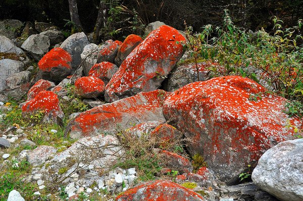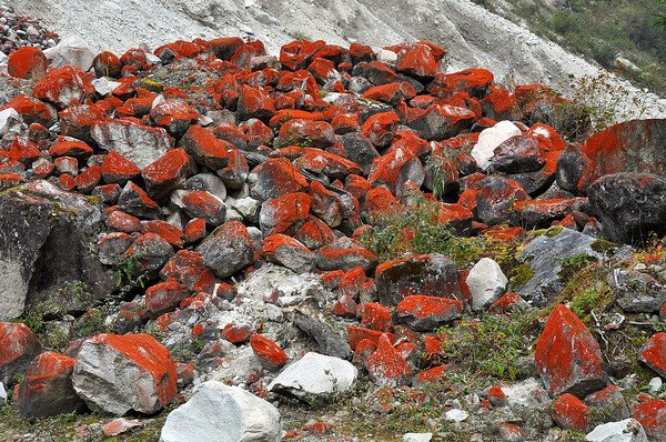 雅家埂两河口地带的红石滩是世界上规模较大的红石滩之一,石头上生长的呈铁锈红的物质是一种极稀有的藻类(地衣的复合体),在湿度、温度、气候适宜的情况下,这种植物就会在岩石的表面自然生长,大概四五年后就会死亡,然后再生。