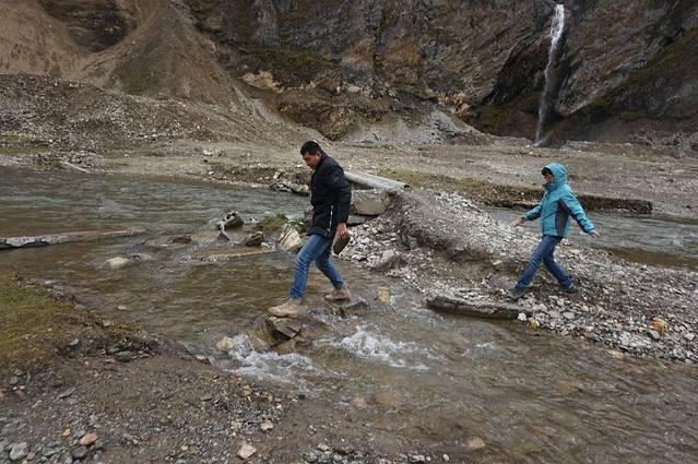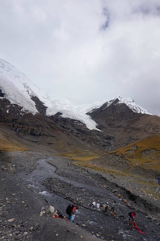 卡若拉冰川下藏民正在洗衣,水是冰冰凉的,藏族女孩就光着脚站在水里。