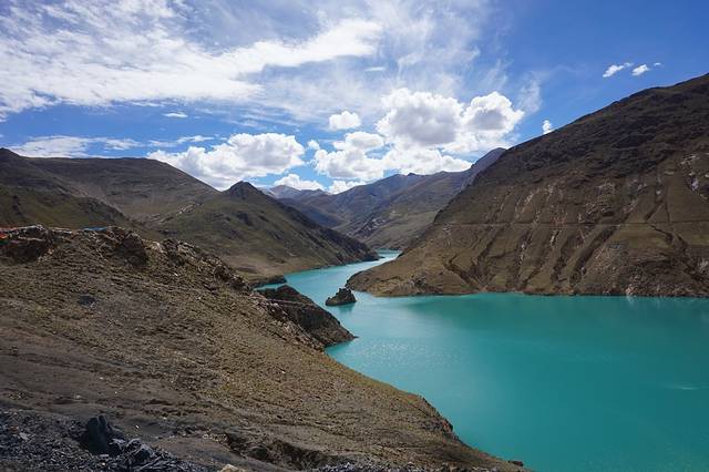 斯米拉山口满拉水库里的古代遗迹,这个湖面是绿绿的颜色,在蓝天白云下一切都是那么美