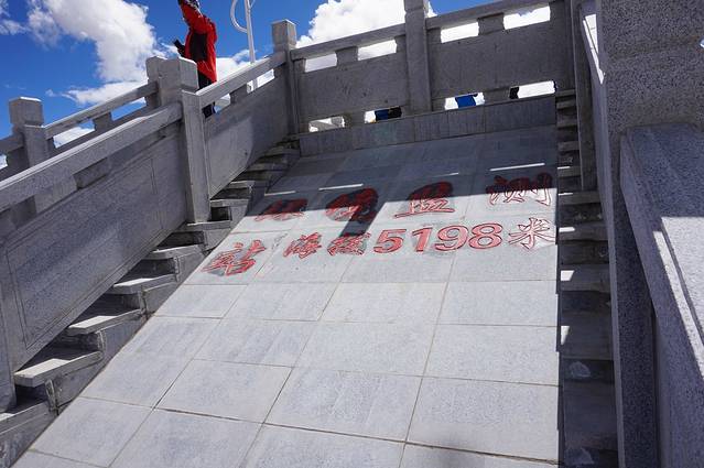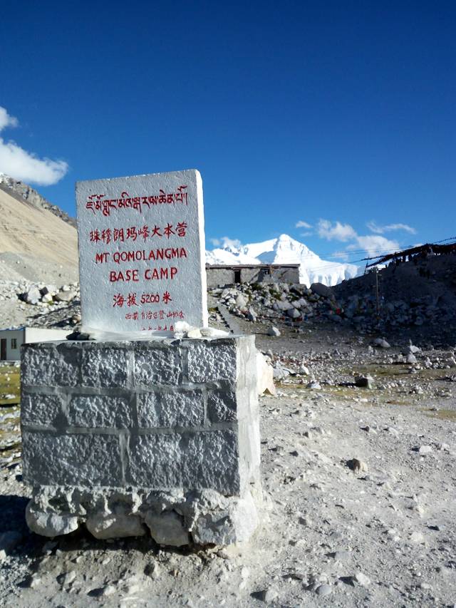 到了大本营后再坐巴士到观景台,25元/人。也有人是自己走上去的。海拔太高我们选择坐车省些力气,下了车以后还要爬一个小山坡。在这里老公走平路都喘的不行,小山坡停了好几回才上去。这个观景台的前方是一片平地,到了登山季,大本营就会迁到这片平地上。地面上有好多用石块拼出来的图案,不知道有没有什么含义。平地旁边有河流。