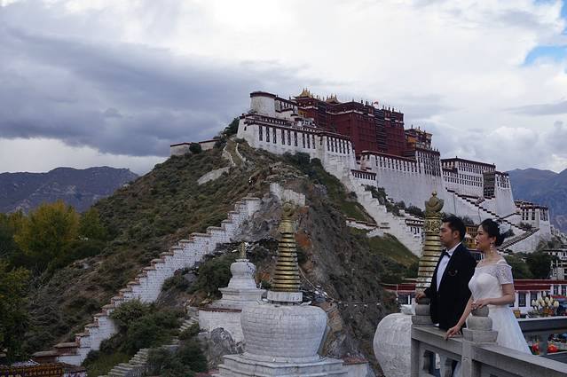 布宫广场西侧观景台上拍布宫,有一对新人在拍婚纱照