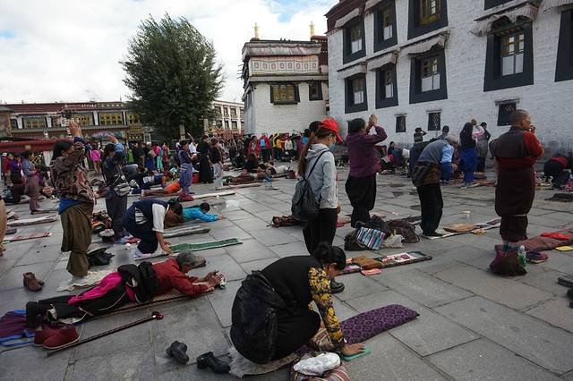 转着转着,突然发现有很多人在拜,定睛一看竟然是大昭寺,就这样突然出现在我眼前,买了票准备进去,错走到朝圣的入口,经人指引才发现有两个入口,又转到游客入口,方才进去。
