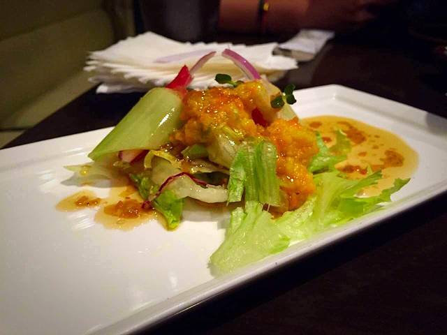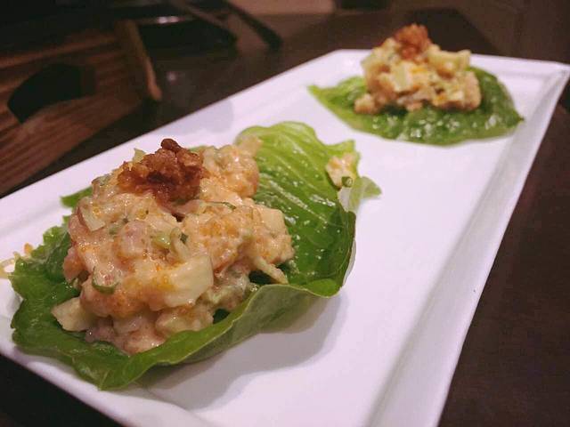打碎的三文鱼和鱼籽拌入苹果粒,生菜包起来一口,那个口感太丰富!