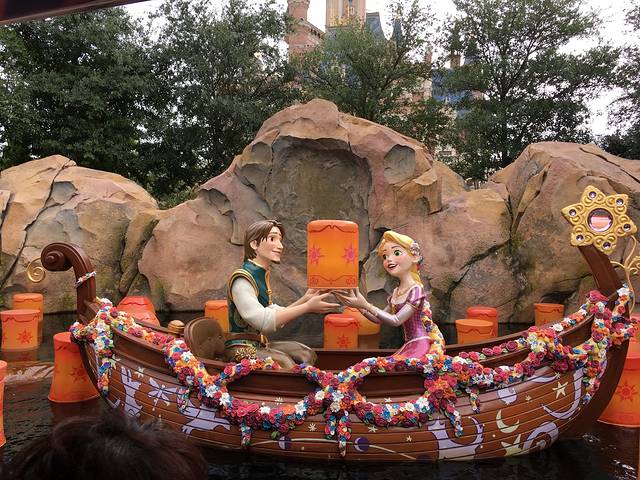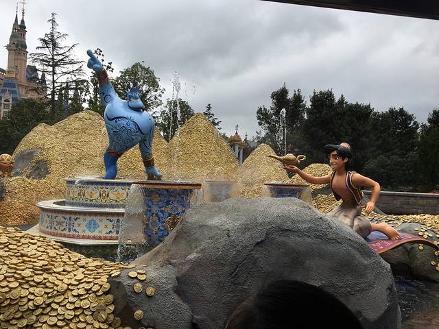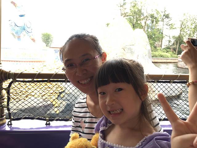 第八站,晶彩奇航 没办法“飞跃地平线”是排不到了,于是转头往梦幻世界跑去,排“小飞侠天空奇遇”很顺利不到二十分钟就排到了,赶紧给开心爸爸打电话让她直接推孩子去“晶彩奇航”进门显示需要排50分钟,但是暂时也想不到去哪里更好了,走到哪里算哪里吧!没想到这个对于四岁半的孩子来说是个出彩的项目,坐着小船欣赏沿途的风景,孩子会发出感叹,妈妈快看小美人鱼,花木兰,兴奋的表情溢于言表!