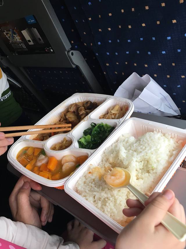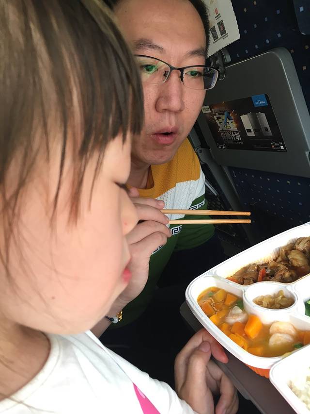 火车上的盒饭,味道一般,65一份,开心和爸爸一起吃