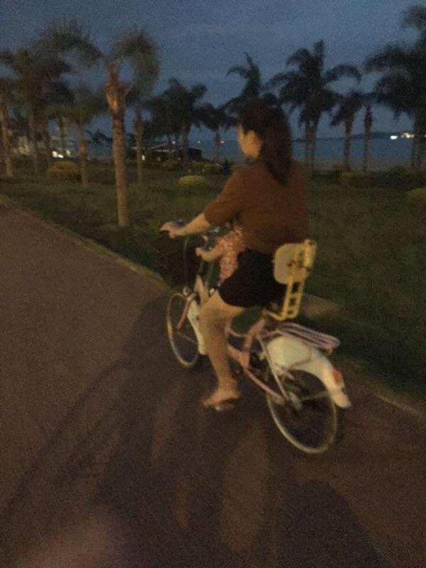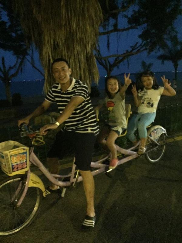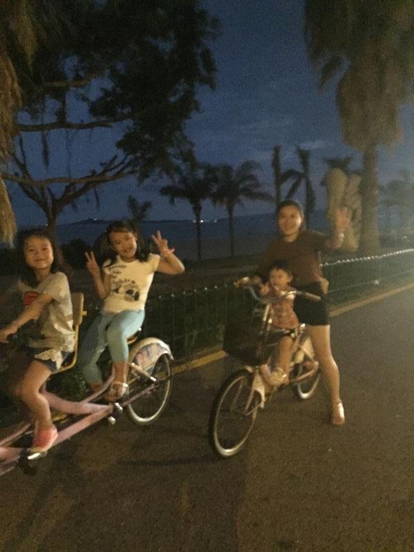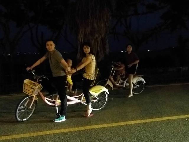 娃们起床已是天黑,计划泡汤,但仍阻挡不了我们前行的道路,环岛路骑车去,经过一番讨论,最终决定三人,两人,单人自行车各租一辆,有了它,带上娃,你追我赶,好热闹