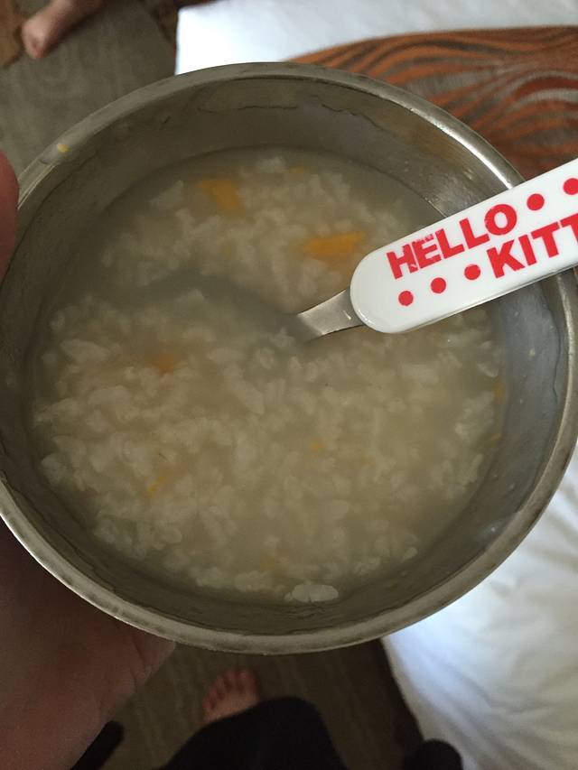第一次带娃,没经验,一上车就喝酸奶,小宝路上吐了好几回,后悔啊,没常识真可怕,不过俗话说,大难不死,必有锅粥,一到酒店,弟弟就分了一大碗地瓜粥过来,真够排谢,一碗粥下肚,宝妈的胆大了许多