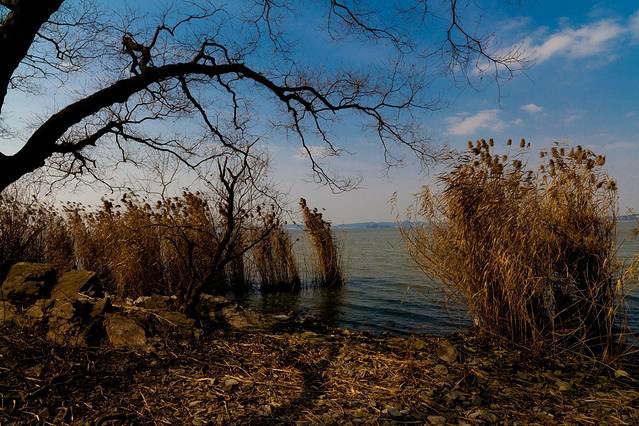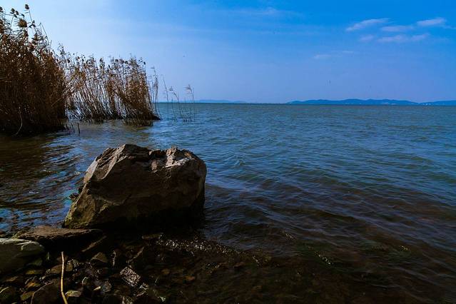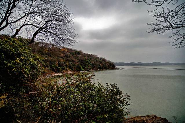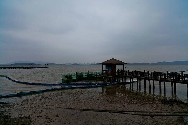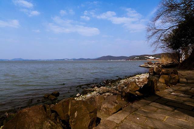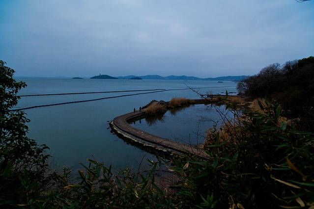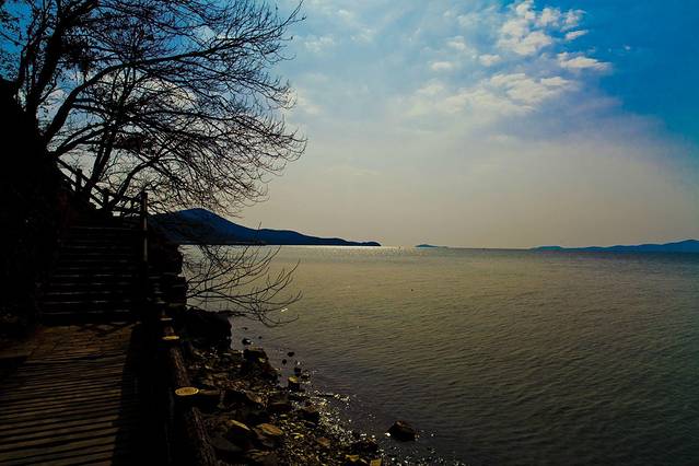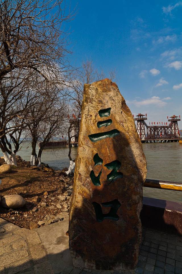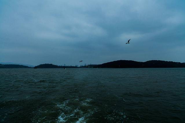 从饭店出来,天似乎转阴转多云了,但风还是很大,犹豫了很久还是决定去鼋头渚去转转。进园后先坐船到太湖仙岛玩玩吧。风可真大,站在甲板后拍了一会儿随风翱翔的海鸥,实在太冷了,迅速逃回船舱。
