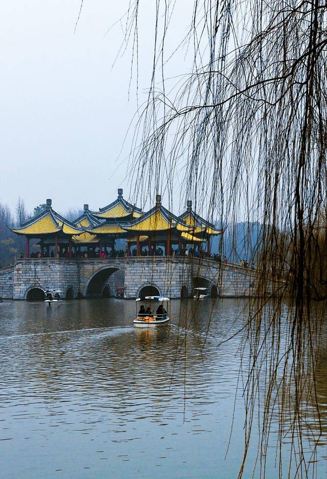 游玩瘦西湖最好的时间应该是在早春或者深秋,早春柳树发芽,柳絮飞舞的时候,美不胜收,而深秋,树叶昏黄,片片飘落也有另外一番景象。我们去的这个时间有点尴尬,还好温度适宜,既看到了春的绿也看到了秋的黄。
