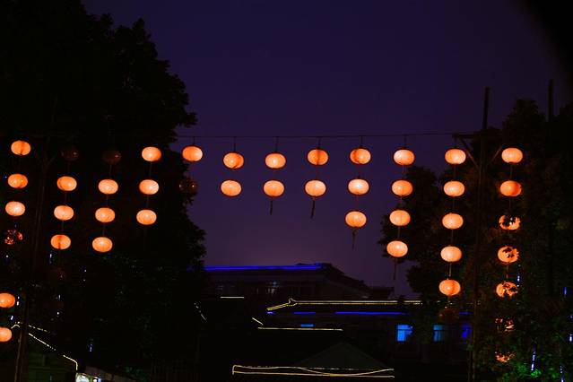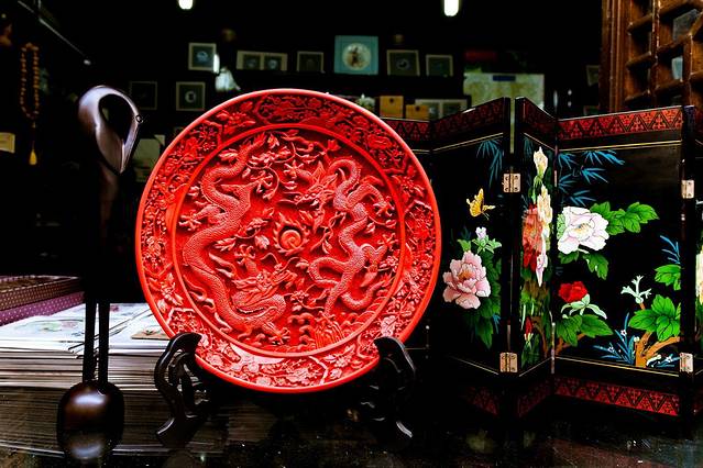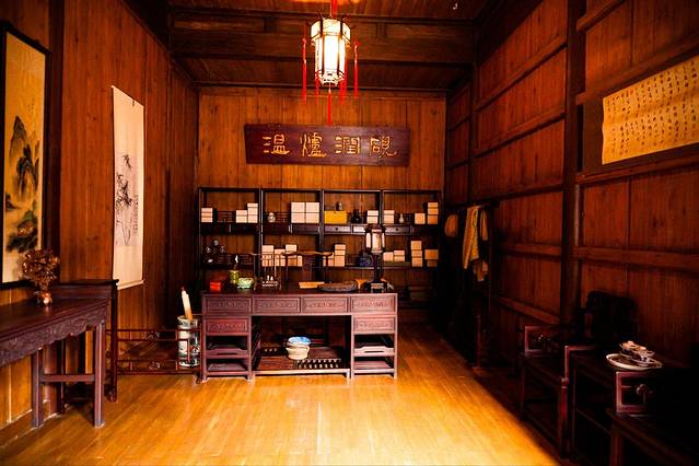 天街商店鳞次栉比,古色古香。仙桃形、石榴形、葫芦形等雕花门窗,玲珑多姿