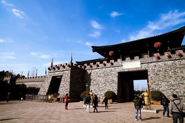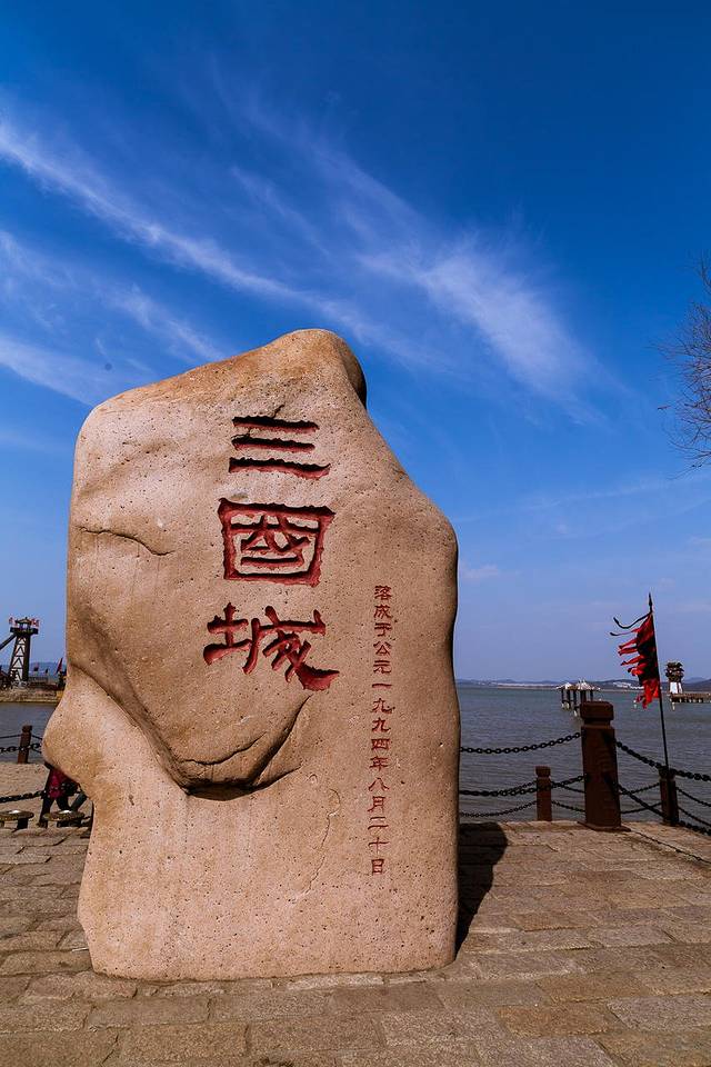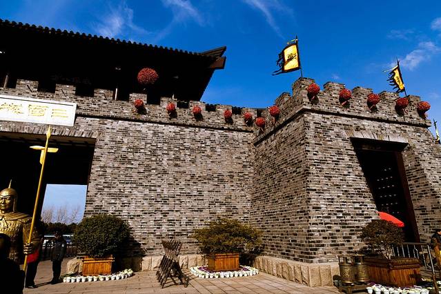 三国城雄浑刚劲,是为拍电视剧《三国演义》而兴建的,“刘备招亲”、“火烧赤壁”、“横槊赋诗”、“草船借箭”、“借东风”、“诸葛吊孝”、“舌战群儒”等十多集重场戏都在这拍的。进门后正好赶上“三英战吕布”大型实景真人演出。