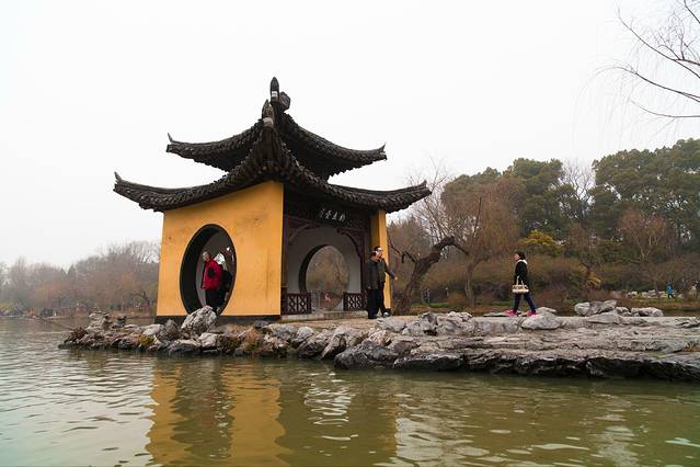 深入湖心的钓鱼台,原来是演奏丝竹乐器的地方。在中国,以“钓鱼台”命名的景点非常多,但扬州的钓鱼台却是众多钓台中体量最小,也是极富特色的一座。它是中国名亭建筑的典范,是中国园林“框景”艺术的代表作品。这里也是到扬州一定要留影的地方。那洞中借景的画面正好对应了“三星拱照”的名称。