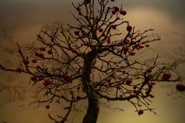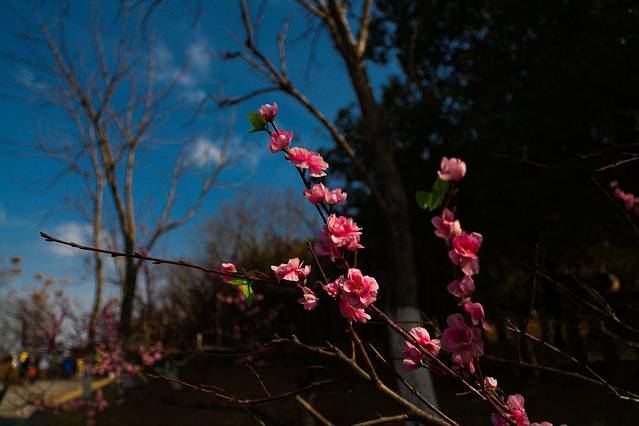 桃园三结义是小说《三国演义》里记载的故事,述说当年刘备、关羽和张飞三位仁人志士,为了共同干一番大事业的目标,意气相投,言行相依,选在一个桃花盛开的季节、选在一个桃花绚烂的园林,举酒结义,对天盟誓,有苦同受,有难同当,有福同享,共同实现自己人生的美好理想。这些桃树桃花都是假的,但几能乱真。
