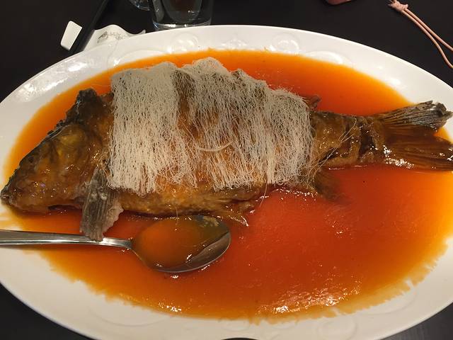 鲤鱼焙面,酸酸甜甜,鲤鱼皮上有一层非常非常细的面,细如发丝。鱼是很大一块,我们都没翻面,吃不下。