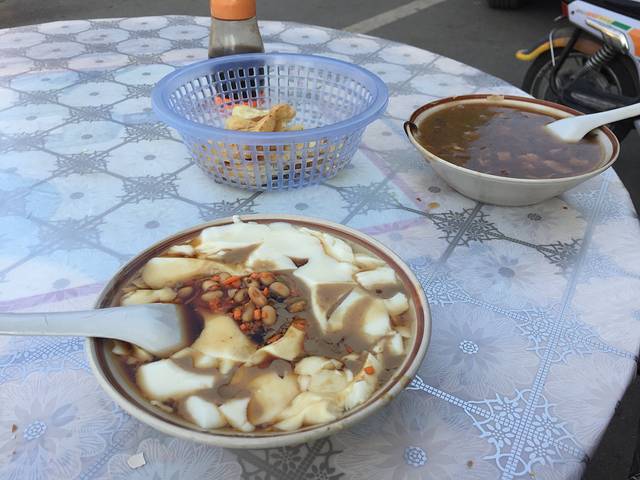 河南大学在开封,那条街那个破烂啊,在门口吃了早饭。饼1块钱,豆腐脑加胡辣汤一共6块。豆腐脑里面加了花生酱。胡辣汤里面貌似是羊肠。。。。看到好多大叔用油条泡汤吃。很嗨的样子。