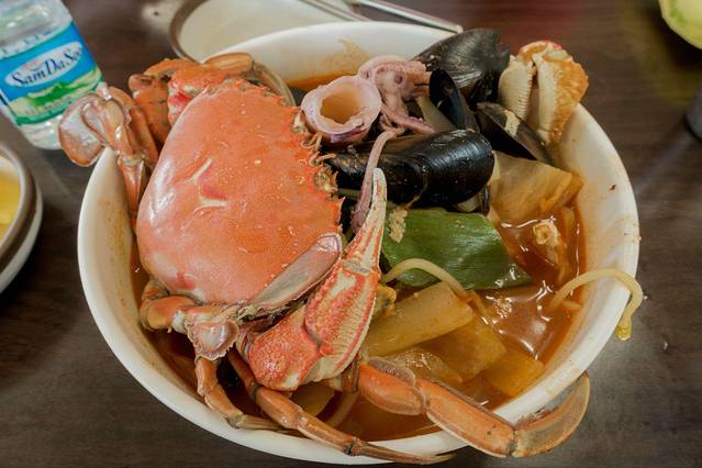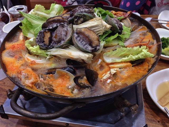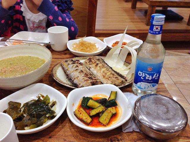 本来想去清涧洞餐厅,结果说是不再接受客人了。只好到隔壁一家也是吃海鲜砂锅的。点了当地有名的海鲜砂锅、海鲜粥和带鱼,泡菜啥的又是一大桌。当然每天一瓶的烧酒必不可少。