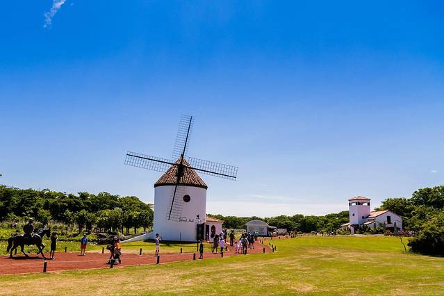 整个园区以欧式风情的白色建筑为基调,有风车,有摇椅,有海盗船,还有人工白沙滩,美丽的园林式景观与大自然完美的融合在一起。