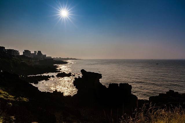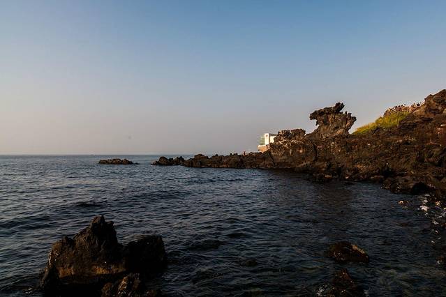 龙头岩是200万年前熔岩喷发后冷却而形成的岩石,高10米,长30米,看上去像是在龙宫生活的龙欲飞上天时突然化作石头一般。 后面隐约的白色的房子就是华美达广场酒店了。