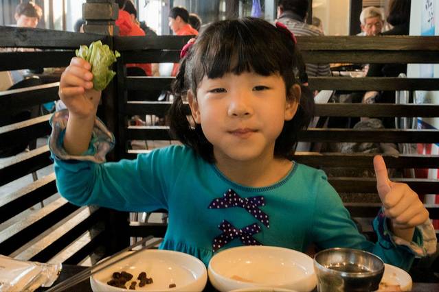 女儿很懂事,明显的给老爸面子。话说韩国烤肉的正确吃法就是将肉烤好,蘸上酱料,和大蒜一起包在生菜或芝麻叶(长得像大号的桑叶)里吃。不过芝麻菜叶味道怪怪的,还是生菜比较清爽,更适合包肉吃。