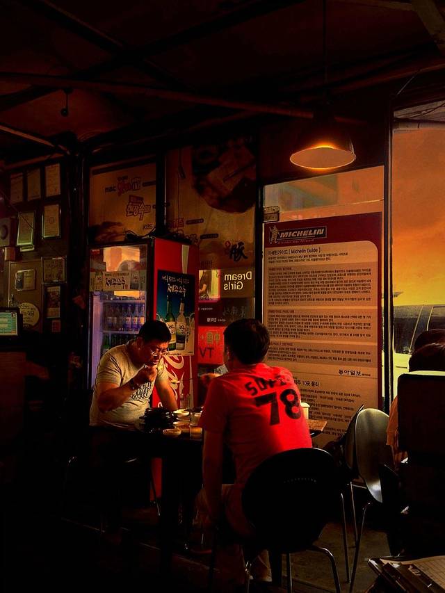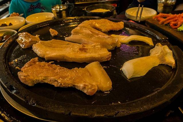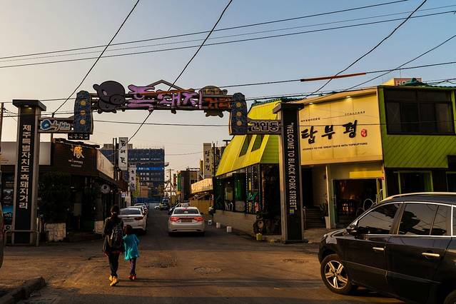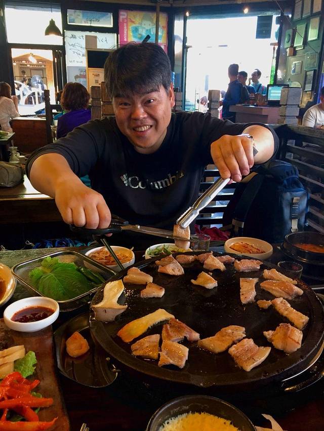 景点上人山人海,也没有心思等着拍日落了,于是打车去黑猪一条街觅食,沿着街从头到尾逛了一圈,找了一家看着生意最旺的进去(豚 Dombe)。黑猪是济州最出名的特产之一,这里的黑猪自然散养,不食饲料与催长剂,生长周期长。因为是天然生长,没有人工因素,因此肉质鲜美。在济州岛,黑猪肉就成了必尝的美食。