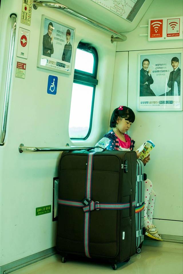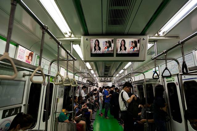韩国的地铁车厢要比上海的宽不少,所以在早高峰时车厢里也显得不是很拥挤。