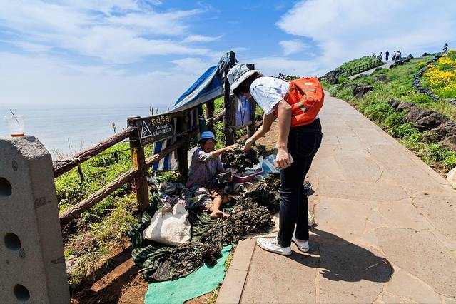 今天要去的地方比较多,如果去坐长途车的话估计时间会非常紧张,决定打车去涉地可支(插播交通信息:济州市区或西归浦市区坐700路环岛东线巴士,到城山下车,然后换乘日出峰循环巴士),50分钟,合人民币一百九不到,三个人平均下来也能接受。