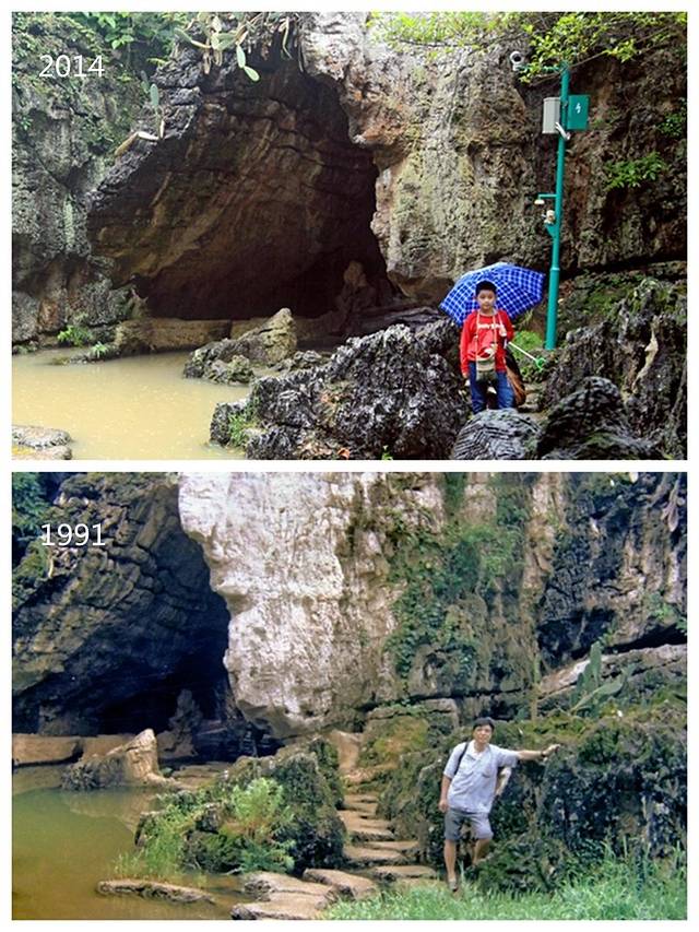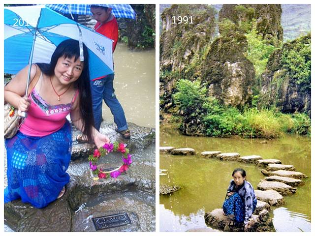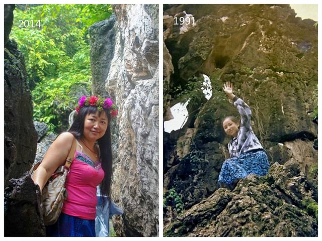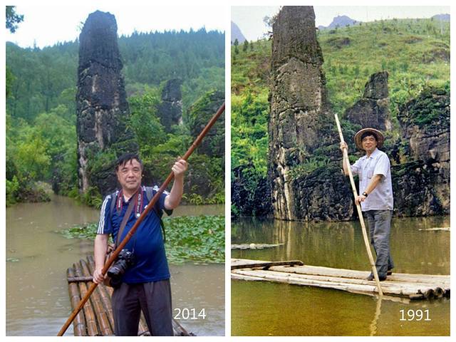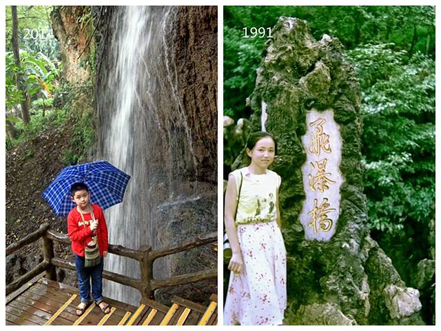 时隔23年后,终于又有机会来到久违的黄果树,而且同样还是全家冒雨出游。面对眼前如烟的大瀑布和天星桥,回看23年前(1991年8月3日)褪色的老照片,真有点岁月如梭的恍惚。蒙蒙细雨中,祖孙三代尽可能努力找到同一地点摄下新的照片,旅游的乐趣跃然心头!