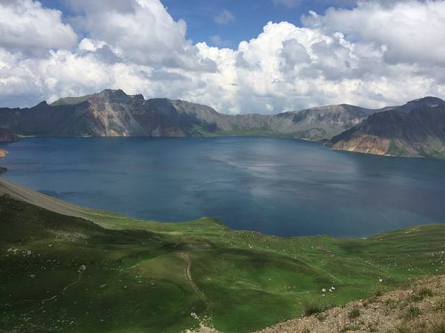 开始走台阶了,哈哈钱500个毫无压力,随着越来越高的海拔还是有点累的,所以不建议大家着急啊,本来就是出来玩嘛,慢慢上景色很好,温度不热还有风还是不错的,慢慢上来也不觉得用了很长时间,在中途休息拍照也很好,我觉得西坡就是比北坡的可玩性更大一些就是在这个爬坡的过程中很有意思,然后我们登顶后就看到了心心念念的天池,真美啊,大晴天,太棒了。