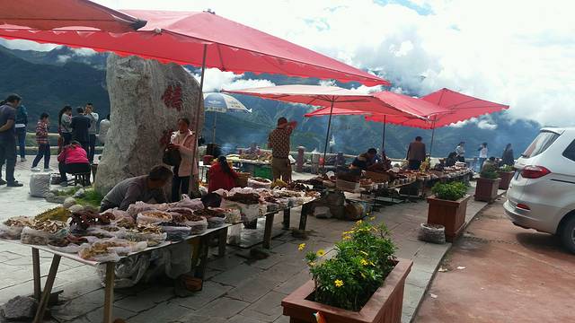 经过二郎山隧道后,明显能感觉到天色、气候的变化,很多人不走石棉而要翻越二郎山就是冲着这种“冰火两重天的”奇特景观来的。(图为穿过隧道后的观景台内卖特产的藏民)