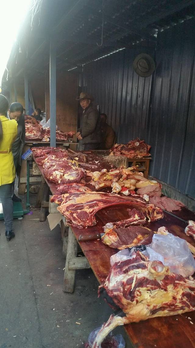 市场上正在售卖刚屠宰的牦牛,他们宰杀的方式特别野蛮(估计我们的屠宰场也差不多,只是没机会看到而已),牦牛肉味道很浓,让人受不了,不过肉确实正宗,30元/斤,挺划算的。(ps.我没买)