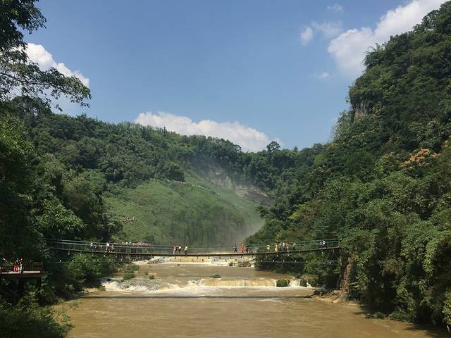 铁索桥横亘在两山之间,远处雾蒙蒙的一片就是大瀑布冲击溅起的水汽,覆盖了整整半座山!