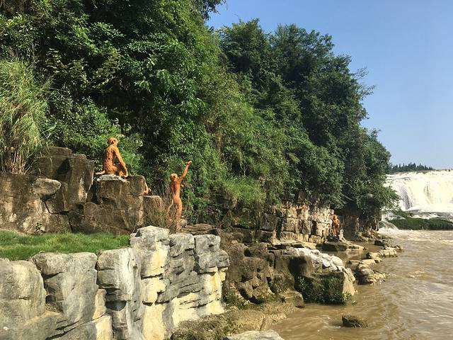 陡坡塘可以从西游古道两侧向瀑布行进观瀑,左边有群猴和二师兄,右边则有偌大的观瀑台以及长长的水上栈道,道上人们匆匆来去,放缓脚步方能发现惊喜。