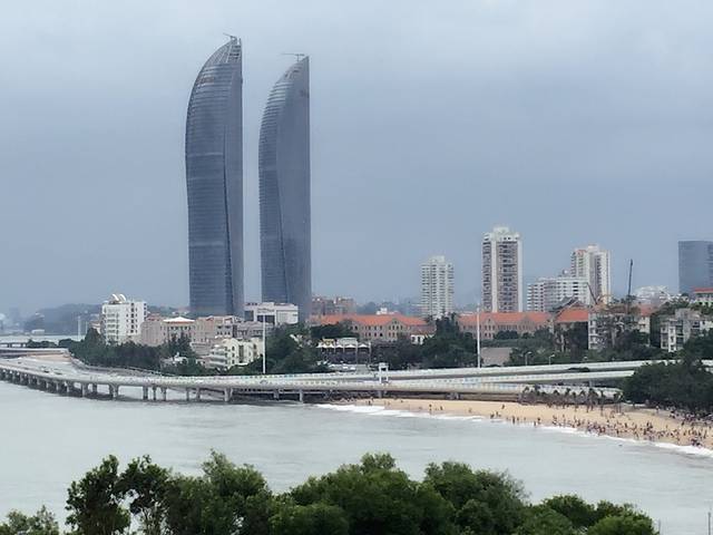 在胡里山炮台看到的世贸大厦和白城沙滩