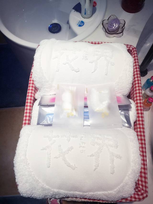 洗浴用品筐里的一次性洗漱用品和毛巾,还是很干净,棉签和浴帽也是有哒
