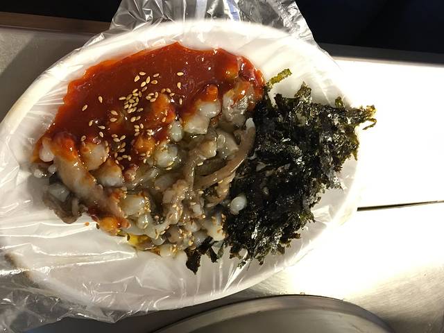 这几个小菜花了折合300多人民币,宝宝不开心了,这其实搁国内任意熟食店都不用那么贵。不是说在韩国就那么贵,根据我们这几天对韩国物价的认识和比对,最后得出的结论是,因为广藏市场通过综艺节目在中国游客中有较大的知名度,所以物价自然拉的高!