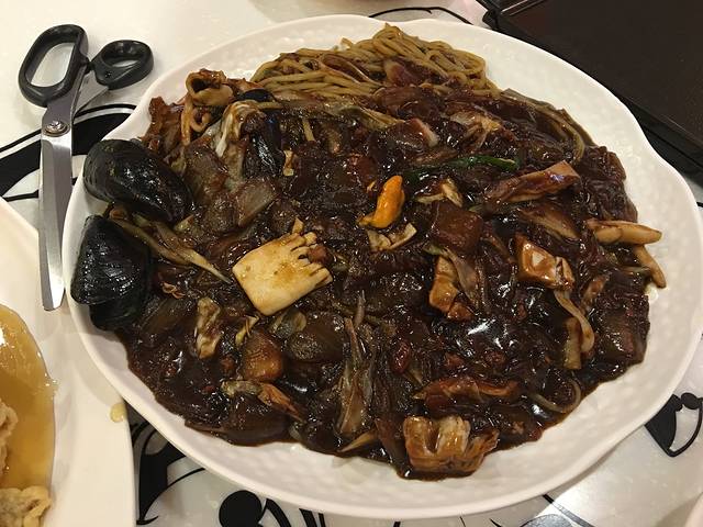 我们点的糖醋肉(锅包肉)和双人份的海鲜炸酱面,三个人吃正好!