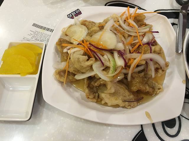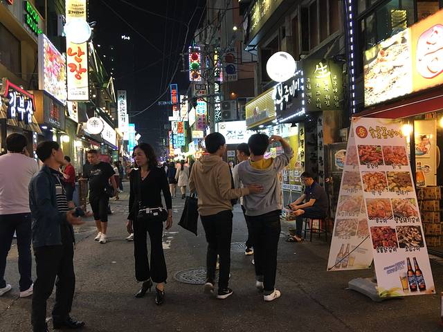 第二天因为回水源比较早,晚上吃过团餐我们就决定去附近散个步。结果!散步就散到了一条美食街,整条街就是各种烤肉各种类似排档的餐馆。附近也有一些鱼饼炒年糕之类的小吃。我们买了一点小吃就边走边吃,还有各种衣帽鞋子眼镜店。我在这里配了一副圆框眼镜外加一对季抛美瞳,老板给我打了折,折合人民币大约300人民币!眼红了一众姐妹,后来她们想去首尔配一副差不多的眼睛时差不多要800人民币这样的,我们又没赶上东大门的夜市。所以她们事后也是各种后悔!而且水源其实也是有商场的,便利店也是全国统一的,团里的导游和代购在便利店进了好多酸奶软糖!我们在水源从晚饭后一直逛到12点还觉得意犹未尽,可惜商铺已经渐渐打烊,然后我们又开导航去买了twotwo炸鸡!原味的最好吃!