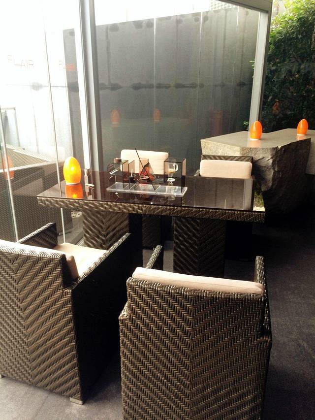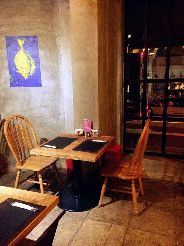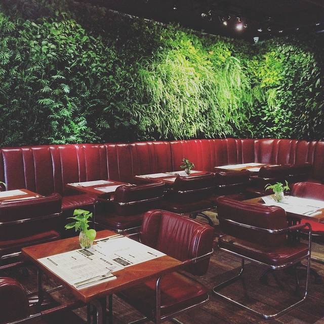 木质的地板、绿色的墙壁、龙虾壁画装饰以及舒适的皮革扶手椅。吧台前同样设有座位,入口处还配置了有高脚桌。餐厅街景view的双人露台景观座让你可以一边享受美食,一边欣赏川流不息的街景,餐厅大部分是开放式座位。