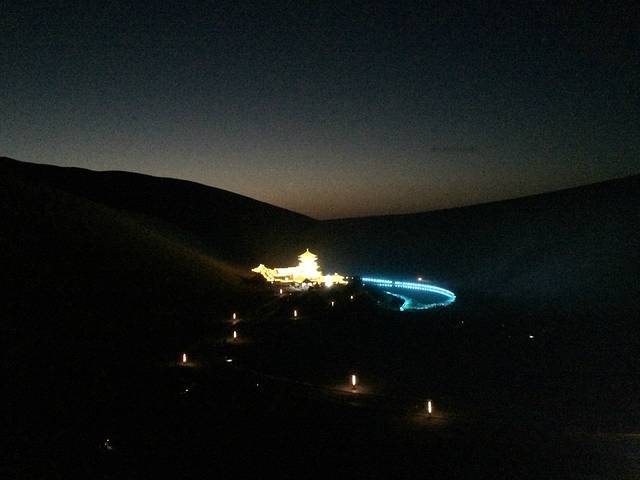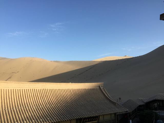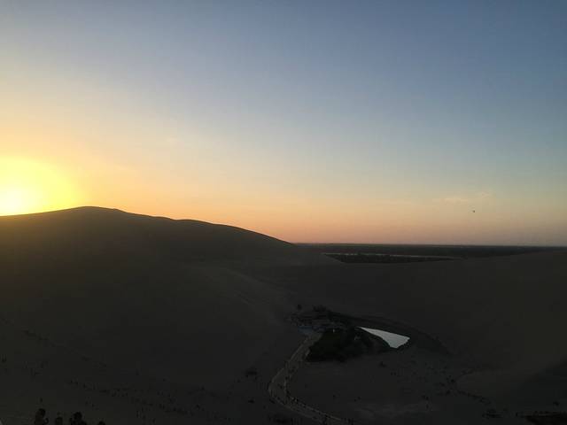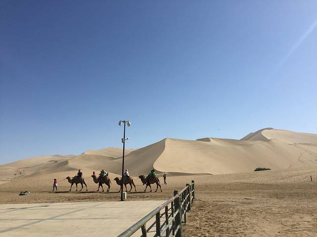 旅舍楼下有条小巷子,是个小市场,穿过去就到了去月牙泉的公交站点,也就是市中心的标志“反弹琵琶”(来自莫高窟壁画)处,2元/人,几分钟一趟,很方便,车程不远,鸣沙山是终点站,中间站点有个新建景区,时间充裕的话可以去转转,公交晚间最后一趟返程时间是21点。鸣沙山月牙泉是一个景区,门票120元/人,骑骆驼100元/人,滑沙15元/人。从外面看是连绵的沙山,不过被景区指示图误导了,其实景区非常的小,沿着栈道走路约5分钟就能看到月牙泉,不用爬沙山,而骑骆驼只是走到远处的沙山再走回来,一圈大约20分钟,不是必须项目。景区内的建筑都是后建的,而月牙泉因芦苇遮挡也看不出有什么动植物。想要拍月牙泉的全景,就要爬对面的沙山,不是每一座山都能爬,景区在沙山上铺了一条软梯,如果直接爬的话,那真的是挑战,累死,爬一步滑下来2/3,而且越到后面越陡,建议如果爬的话也在软梯附近,可以随时改。爬上沙山就可以观看日落了,沙漠的日落很美,十一期间日落大约在19:30。月牙泉晚上开灯时间是20:00整,想拍夜景的话就晚些下山,下山非常快非常容易。