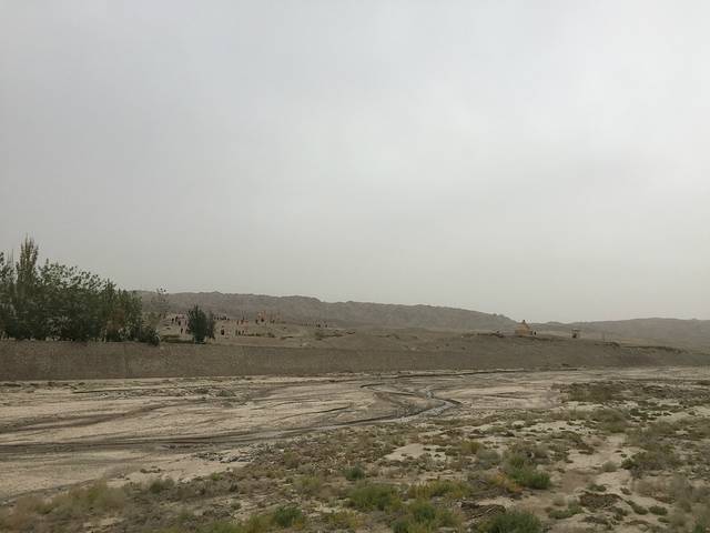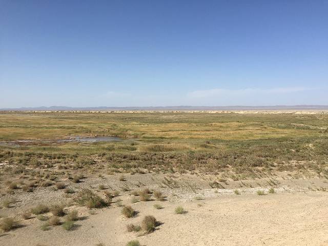 古董滩—遗址—湖—沙漠—雪山,当天有风,风沙的缘故雪山不是很清楚,左侧就是绿洲