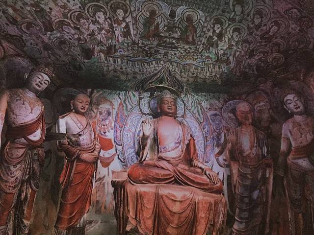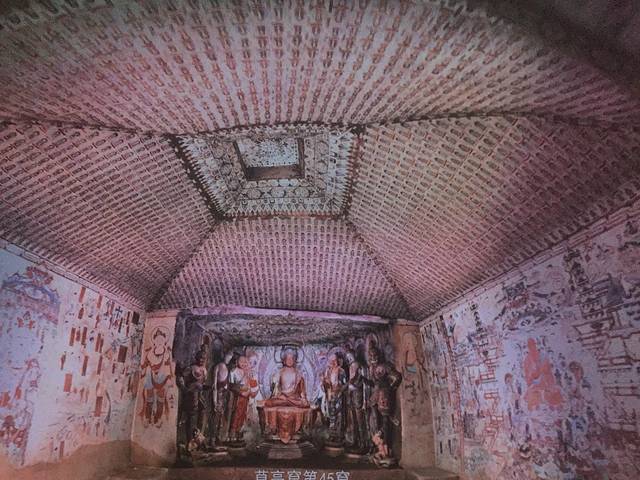 球幕影院,第45窟,莫高窟内的壁画彩塑人物皮肤都应该是白色的,可是因为日照空气氧化,很多都变成黑色的了,壁画上的颜色很多是用宝石来调色,蓝色蓝宝石,红色红宝石,壁画上的千佛面部都贴有铂金,可惜留存的不多,都被刮走了。泥塑工艺精湛,无论人们从何处跪拜,都会感觉佛在注视自己。